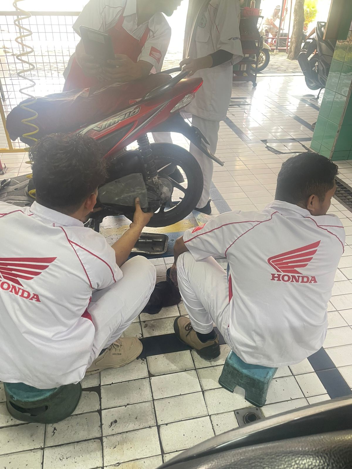 Dua guru yang ditugaskan mengikuti serangkaian kegiatan, mulai dari observasi standar operasional prosedur (SOP) bengkel resmi Honda, sistem pelayanan pelanggan, manajemen suku cadang, hingga praktik langsung penanganan sepeda motor berbasis teknologi injeksi. Melalui kegiatan ini, guru memperoleh pembaruan kompetensi teknis sekaligus wawasan tentang budaya kerja industri yang profesional, disiplin, dan berorientasi pada kualitas layanan.